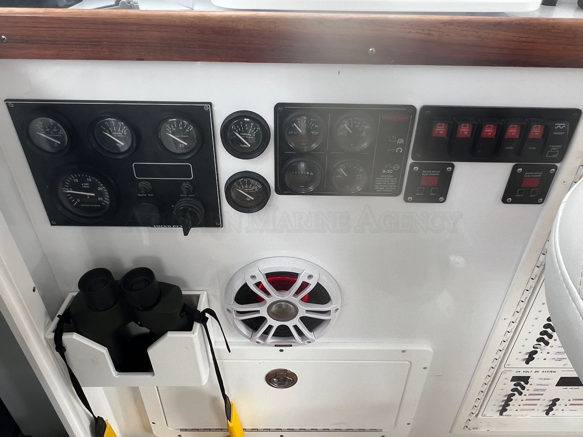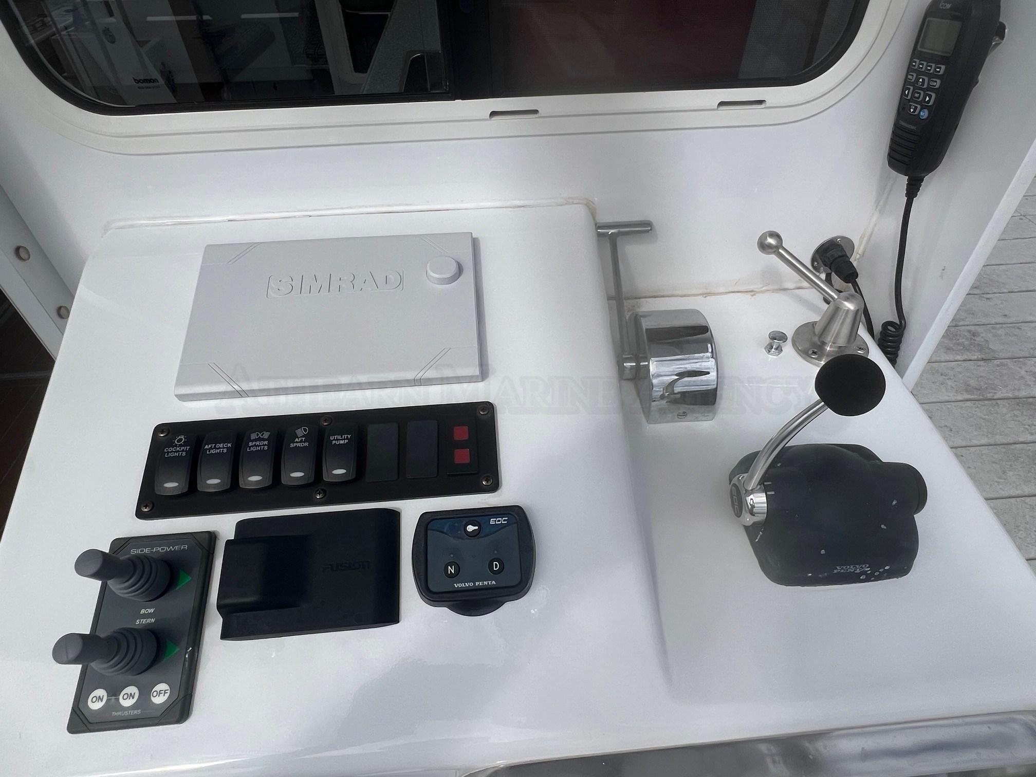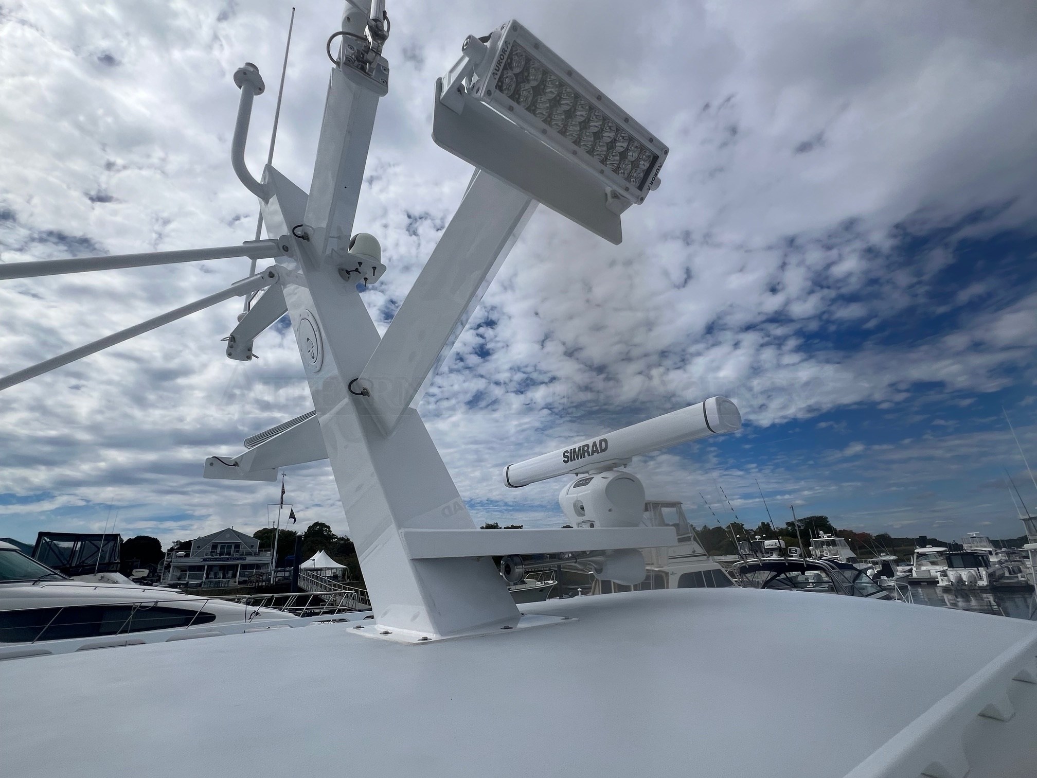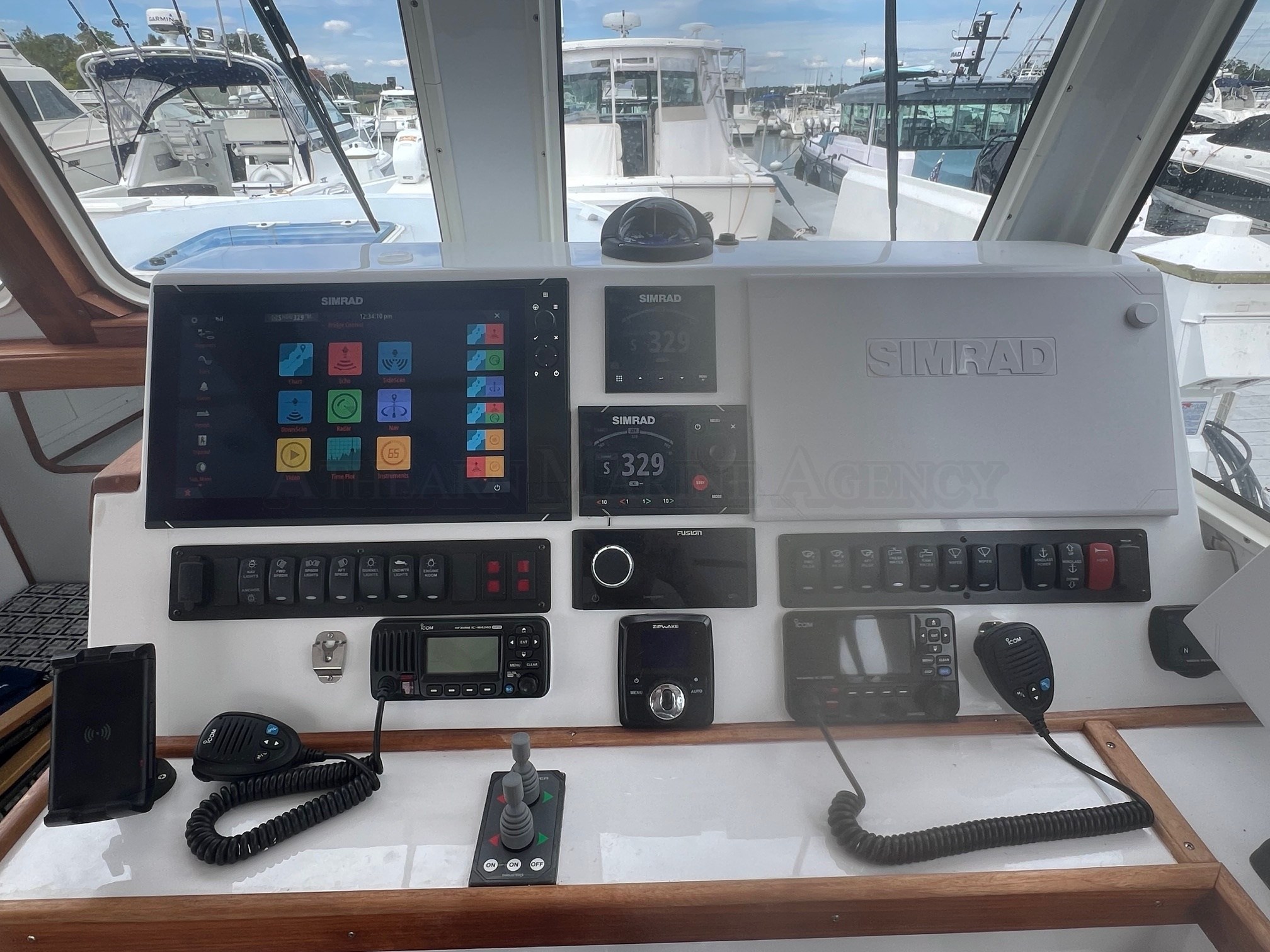 Radar: Simrad VHF: Icom M510, Icom M424G DSC VHF: (6) speakers AutoPilot: Simrad VMS (Black Box): Iridium satellite phone (antenna-roof mounted) VHF rear: Icom mic. station w/ speaker 8-spot lights (night vision) Simrad HALO - 4KW open array (2) Simrad NSS2 - 16" & on deck 9" (3) external flat screen (2) Fusion stations Simrad info display - 4" Structure scan |