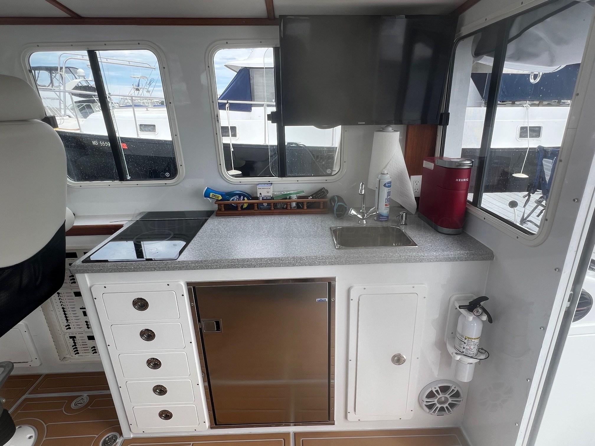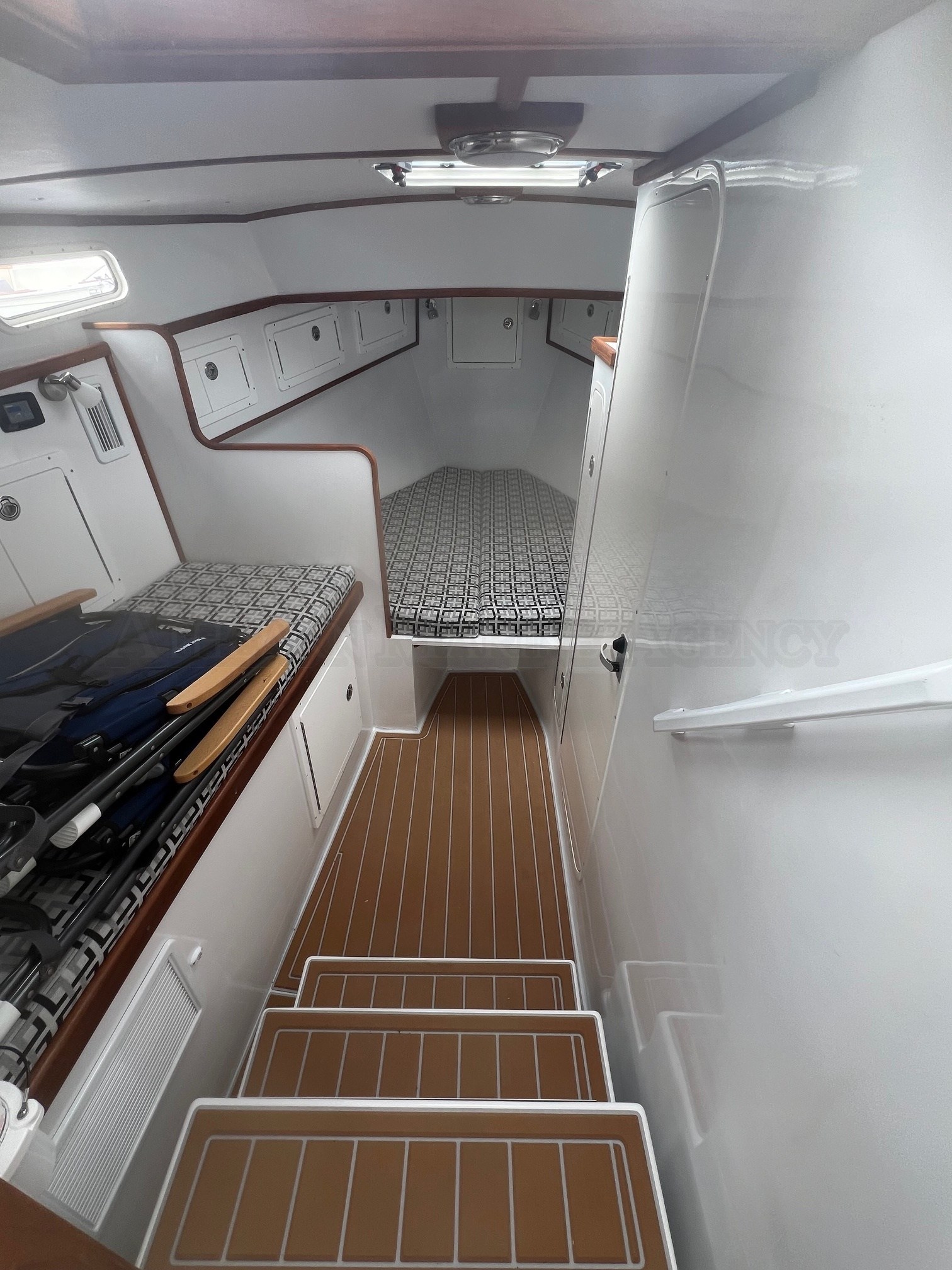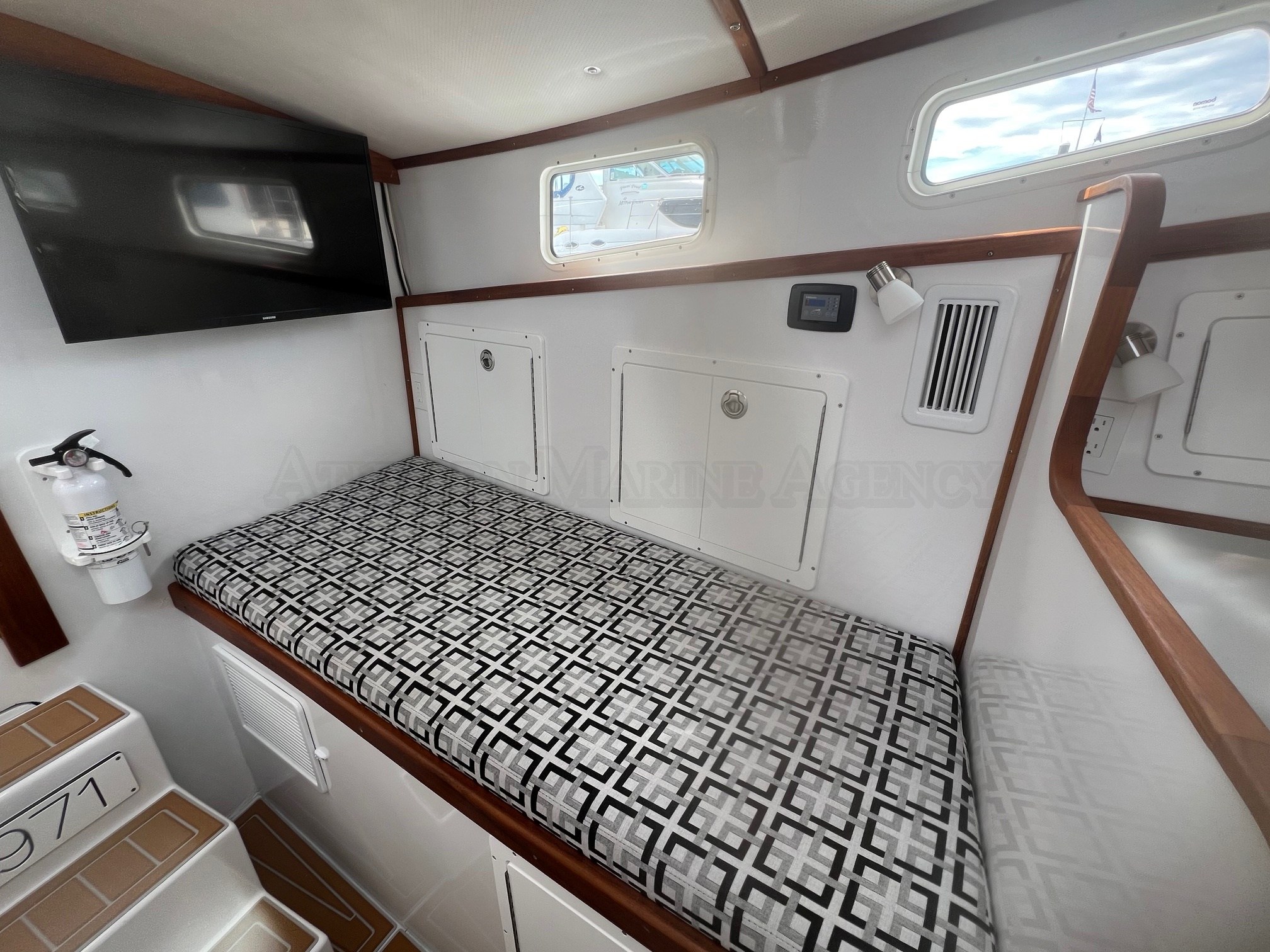V-berth forward Salon (table drops to single berth) Single berth port down forward Stainless steel single basin sink Isotherm refrigerator/freezer Raritan electric head/shower Kenyon - dual electric cooktop - 2 burner Webesto AC / heat - 16KW (salon) Webesto AC / heat - 12 KW (forward) Dual burner electric cooktop 20 gallons of black water 20 gallons of freshwater intake 84 Gallon fresh water tank Hot water tank - 11 gallon |
