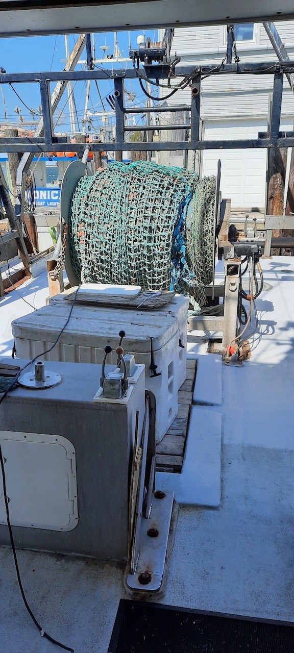 Hydraulic split trawl winches (2) steering stations - main helm cabin & midship starboard side Steel a-frame mounted aft stern deck Hydraulic net drum - centerline Fin-style outriggers port/ starboard |